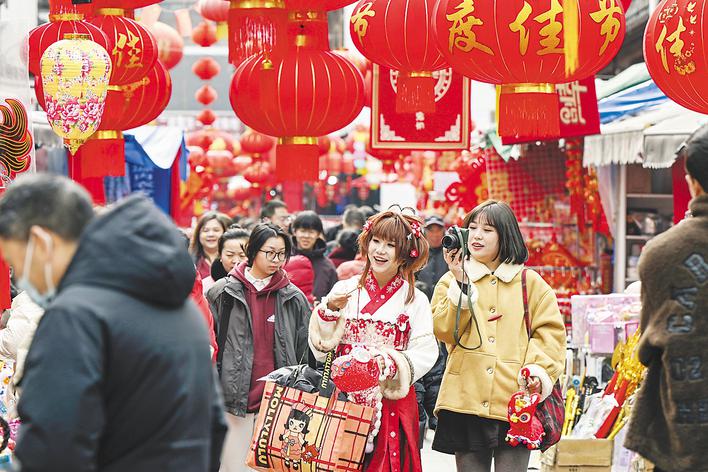 2月1日,在城隍庙,市民正在选购新年饰品。春节临近,合肥城隍庙市场内挂满了大红灯笼、春联、中国结、马年饰品等节日饰品,吸引了不少市民前往选购。通讯员 赵明 摄