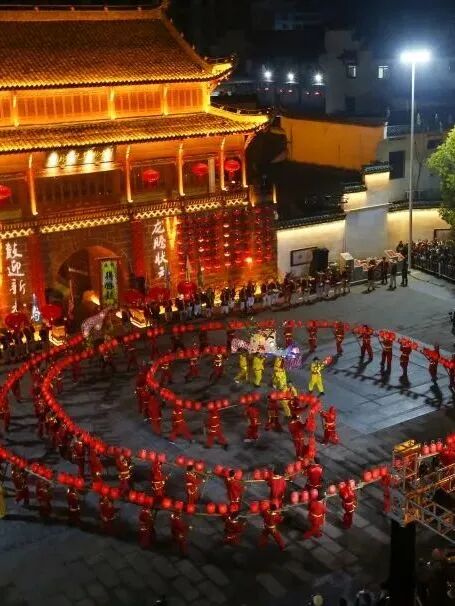 徽州板凳龙与得胜鼓方阵巡游,穿越核心街区定点表演。