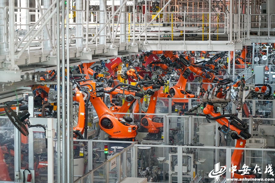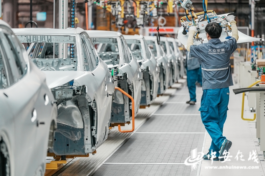 工人在大众安徽智能电动汽车生产线上忙碌