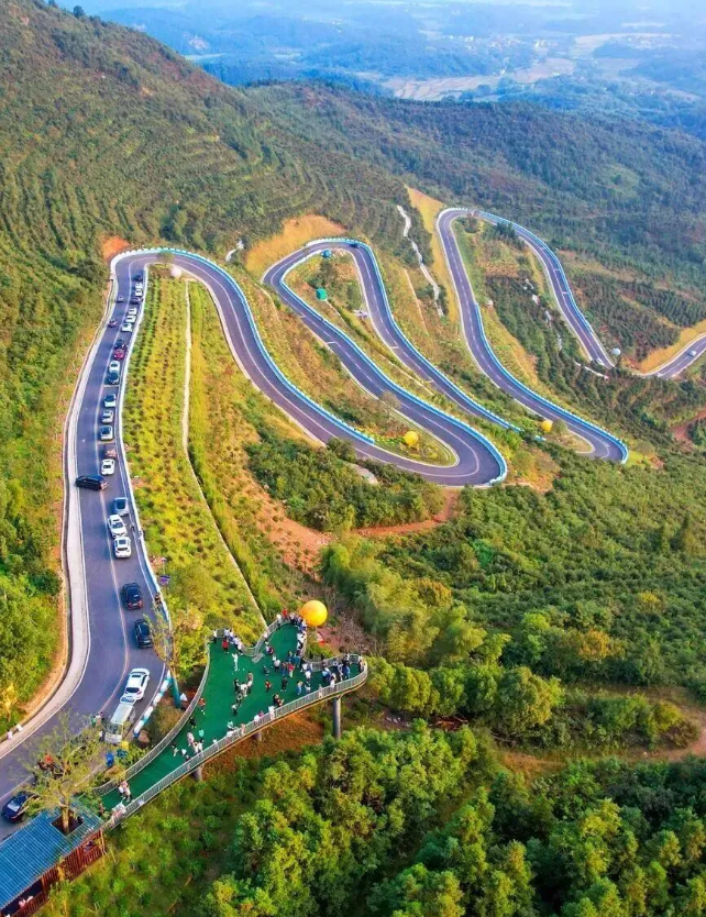 蜿蜒的"六道弯"是庐南川藏线的精华路段,从高速泥河道口下,来到双顶山观景平台,俯瞰满目青翠,远眺群峦深远。