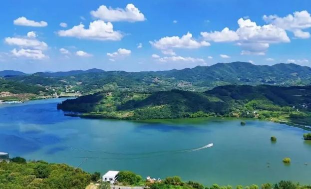 金汤湖静卧山间,碧波如镜,环湖步道绿树成荫,沿着湖边步道漫步,阳光洒在宽阔的湖面上,碎金跃动。
