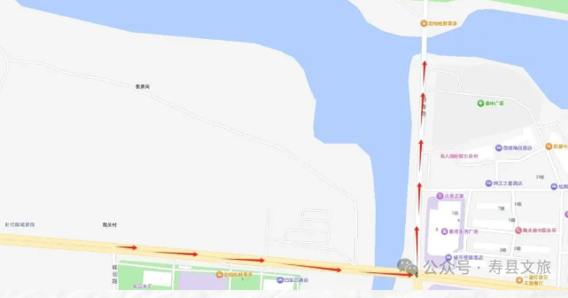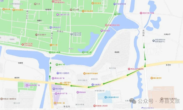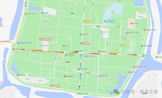 滁新高速紧邻寿县新城区,导航至寿县古城,淮南西/寿县出入口距寿县古城景区自驾仅需7公里。下高速后向西一路直行,顺着主干道便能直接到达。