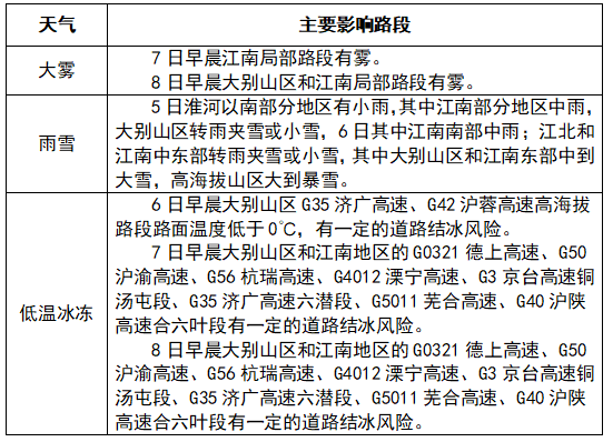 降水预报:我省有明显雨雪天气,降雪主要时间段在6日白天,江北和江南中东部转雨夹雪或雪,其中大别山区和江南东部中到大雪,高海拔山区大到暴雪。