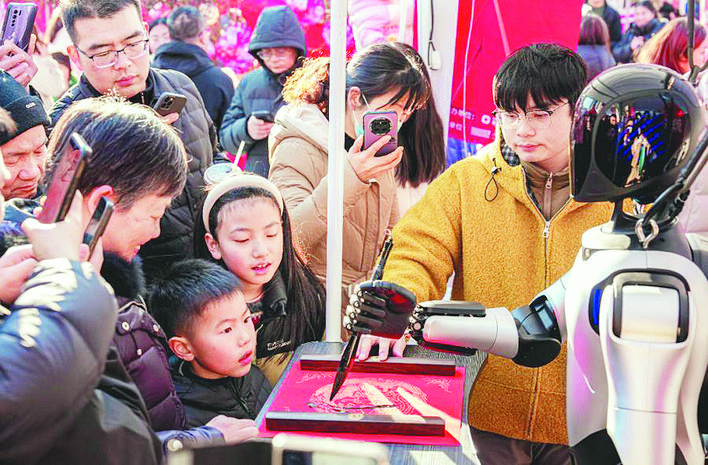 “看!是机器人在写‘福’字呢!”同样受欢迎的还有机器人“远征”,只见它手握毛笔,挥毫写下“福”字,灵活的动作令市民啧啧称奇。