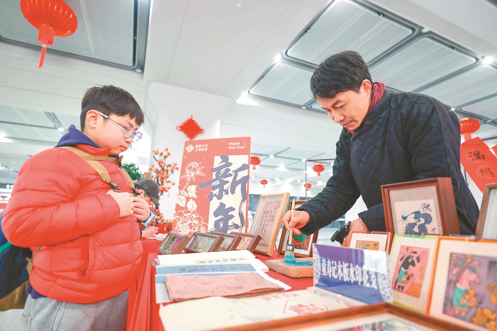 2月11日,合肥市蜀山区文化馆在合肥西站举办“翰墨传情 福满归途”主题活动,把春联、花笺等暖心礼物送到南来北往的旅客手中。图为小朋友在“木板水印花笺”展示台前感受非遗魅力。记者 范柏文 摄
