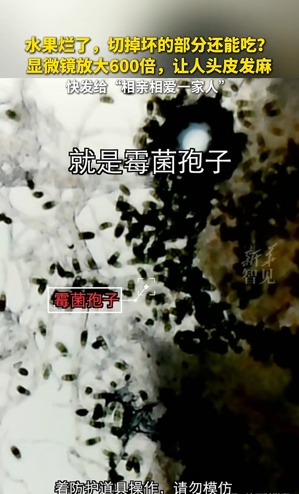 近期,一位短视频博主用显微镜把烂水果放大了600倍,结果看完让人头皮发麻:腐烂区域的果肉中布满了密密麻麻的霉菌孢子,周围还蔓延出大量菌丝。