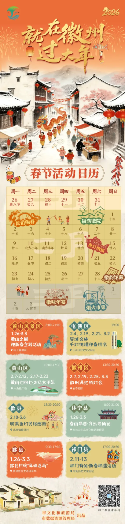 唐模被誉为“水口园林第一村”,村落流水潺潺、古桥映影,徽派民居错落分布,兼具田园诗意与徽州古村底蕴。鱼灯巡游、民俗演艺、河灯祈福、沉浸互动轮番上演,只待你前往,感受古村新春韵味。