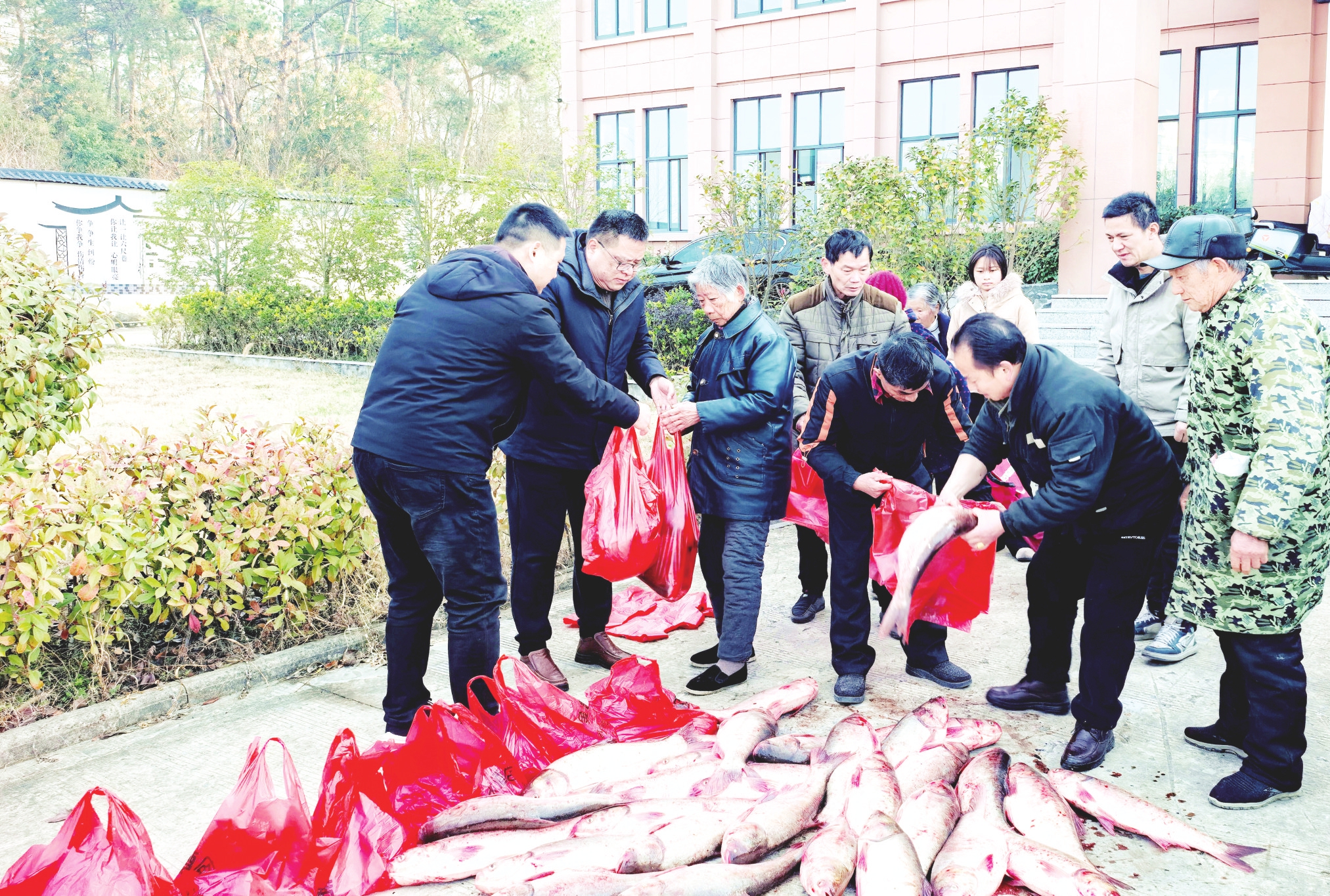 2月10日,桐城市新渡镇爱心业主兆文生向罗潭村五保户、低保户送鱼肉,帮助困难群众欢度春节。