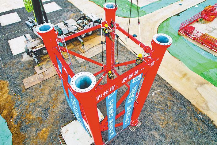 “庐州塔起升!”吊车起重臂缓缓移动,在工程人员操作下,4根11米高的钢柱逐渐安装就位,庐州塔塔身主体第一节成型。
