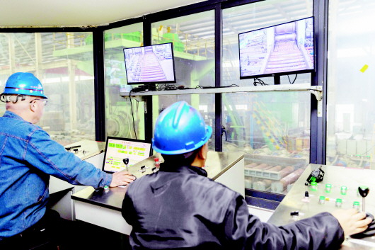 图为安徽中钢联新材料有限公司轧机操作室内,工作人员在观察生产线运行情况。