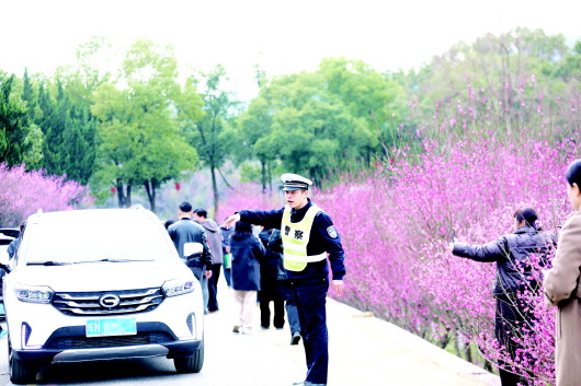 2月18日,农历正月初二,天气晴好,舒城县舒茶镇九一六茶园梅花竞相绽放,吸引了大量周边游客前来观赏。舒城县公安局交管大队联合舒茶派出所安排警力指挥交通,共同维护景区周边良好的交通秩序。图为执勤辅警在景区道路上疏导交通。
