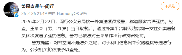 2月26日晚,@警民直通车-闵行 发布警情通报:2026年2月22日,闵行公安分局接一外卖送餐员报警,称遭顾客言语骚扰。经查,王某某(男,21岁)当日取餐后,通过外卖平台聊天功能向一女性外卖送餐员多次发送了骚扰信息。警方已依法对王某某作出行政拘留处罚。