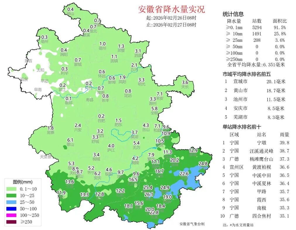 昨天全省大部分地区出现降水,其中沿江江南中雨(覆盖全省面积25.8%),宣城、黄山部分地区大雨,最大宁国宁墩39.8毫米。