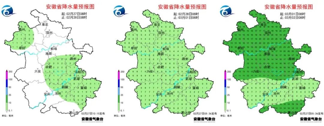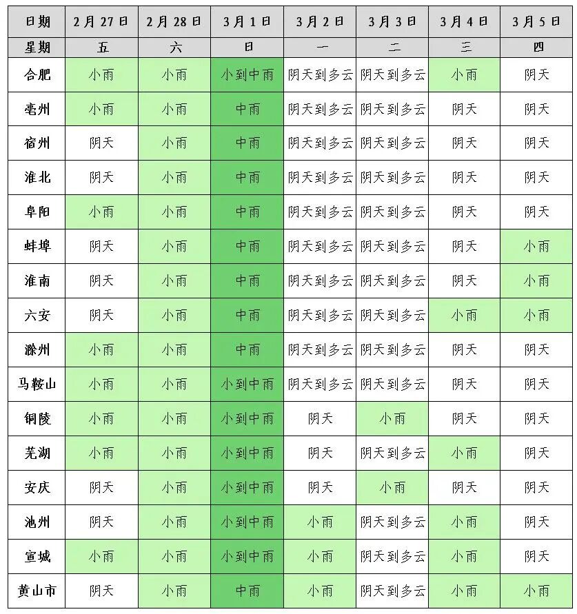 3月1日前合肥市持续阴雨,5日前后还有一次降雨过程。未来十天最高气温15~18℃,最低气温5~8℃。