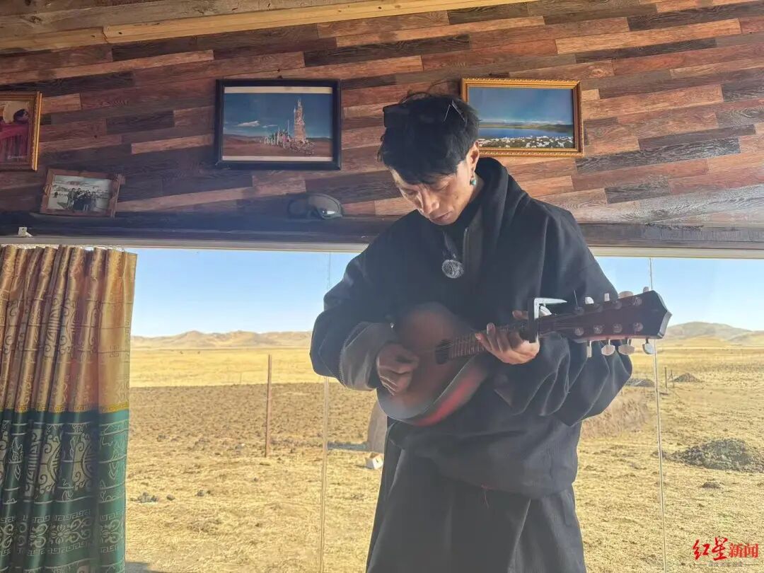 ▲在牧场上,扎西最近刚买了一把曼陀林练习弹奏
