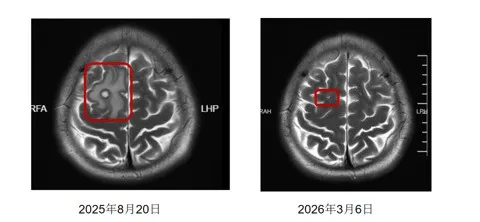 经过系统性、针对性的规范治疗后,患者颅内病灶水肿逐渐吸收,出现缩小趋势。此次小王和妻子来院进行半年复查,是确认病灶是否进一步缩小,评估治疗效果与身体恢复情况,以便调整后续治疗方案以及用药指导。