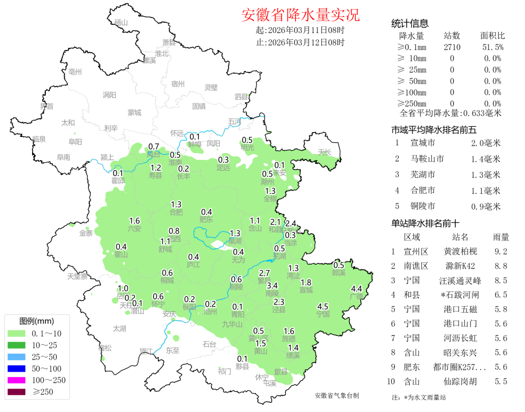 11日08时-12日08时全省降水量实况