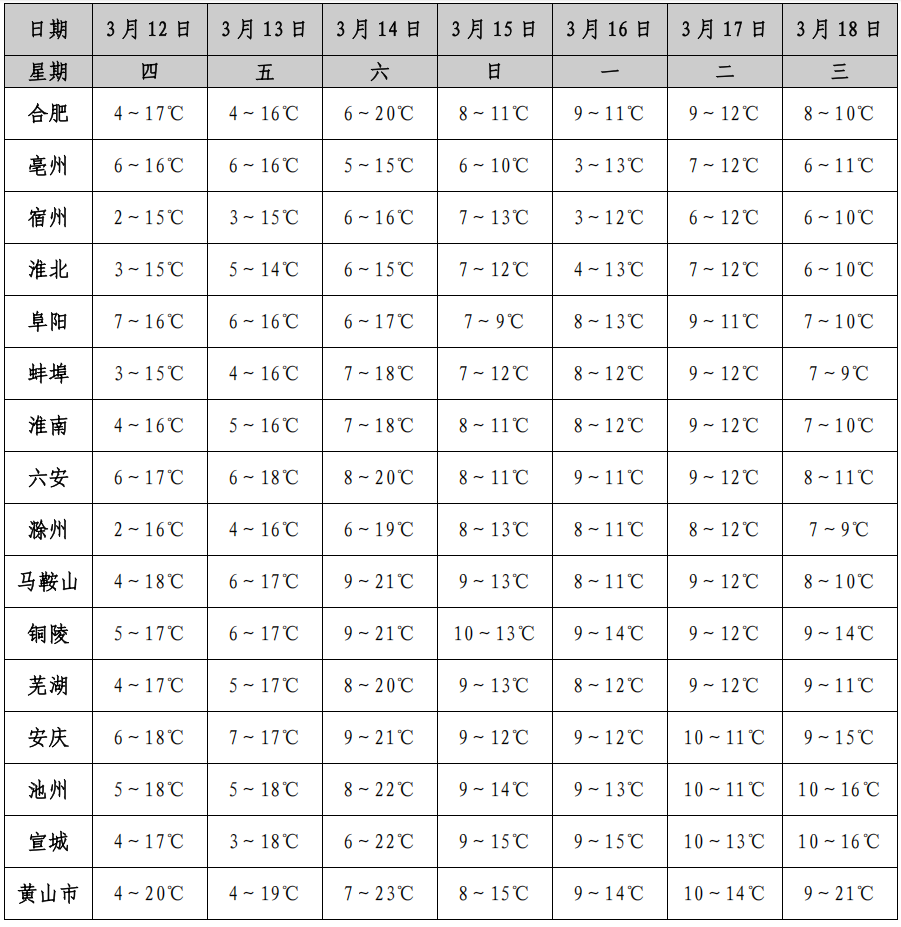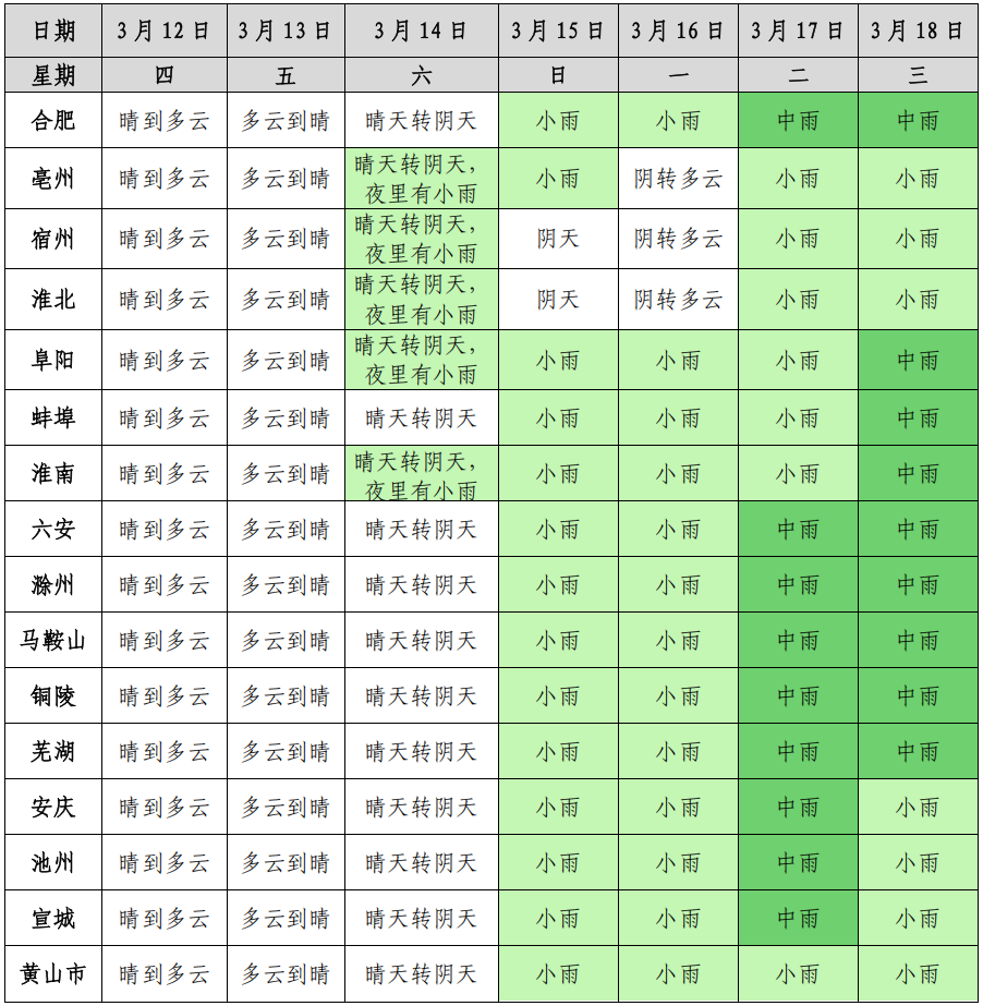 未来十天,合肥市12-14日晴到多云,15日起多降水过程。