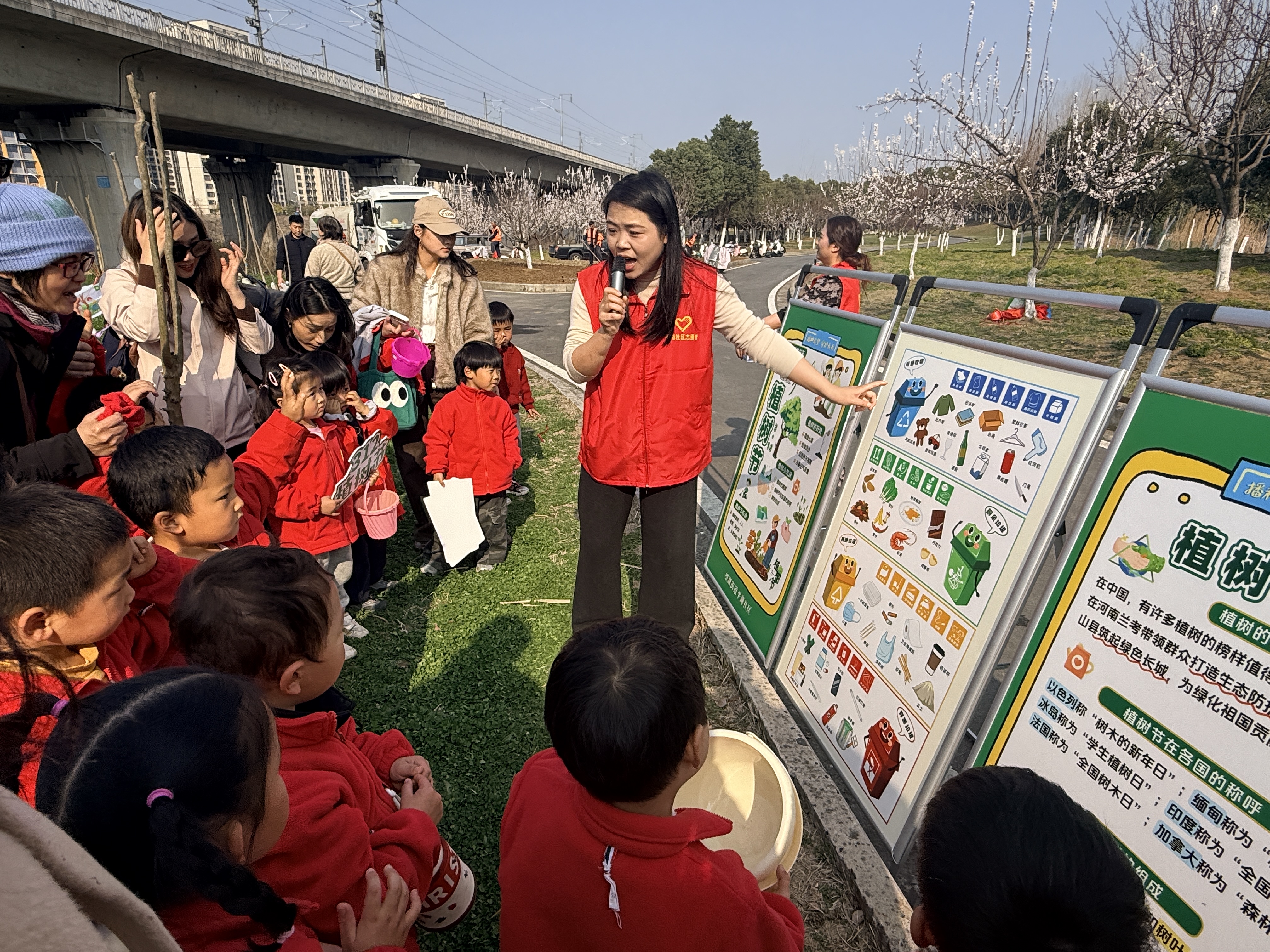 下午2时30分,在技术人员指导下,大家分工协作、默契配合,挥锹挖坑、扶苗培土、提水浇灌,每一个环节都认真细致。志愿者们干劲十足,孩子们也在老师的带领下,种下属于自己的“成长树”。一棵棵桂花、樱花、红叶石楠等适生树种在春风中挺立,为高铁四期游园增添勃勃生机。活动现场还设置了生态文明宣传展板,志愿者们同步开展垃圾分类、水土保持等知识宣传,营造出浓厚的爱绿护绿氛围。