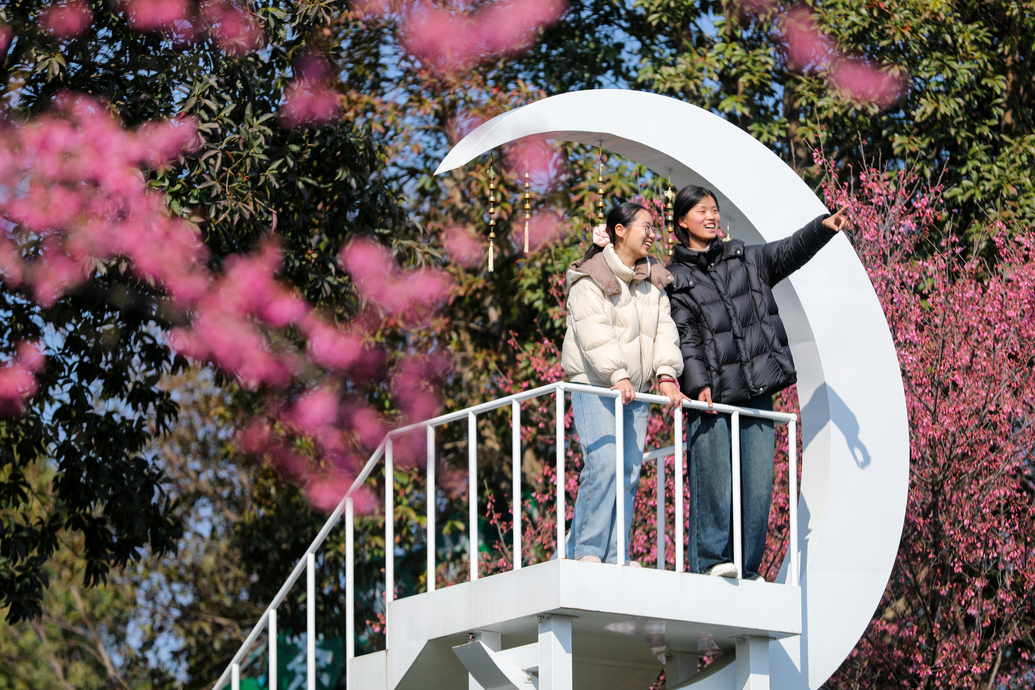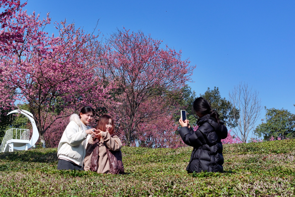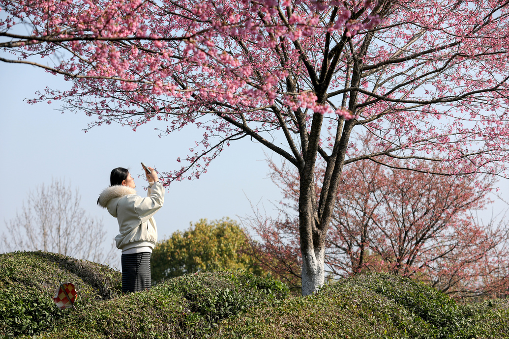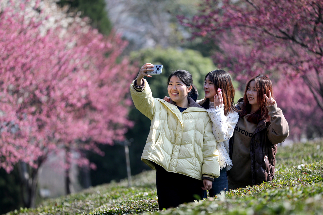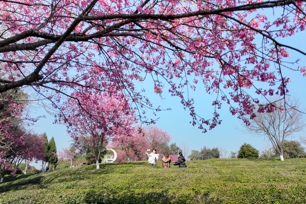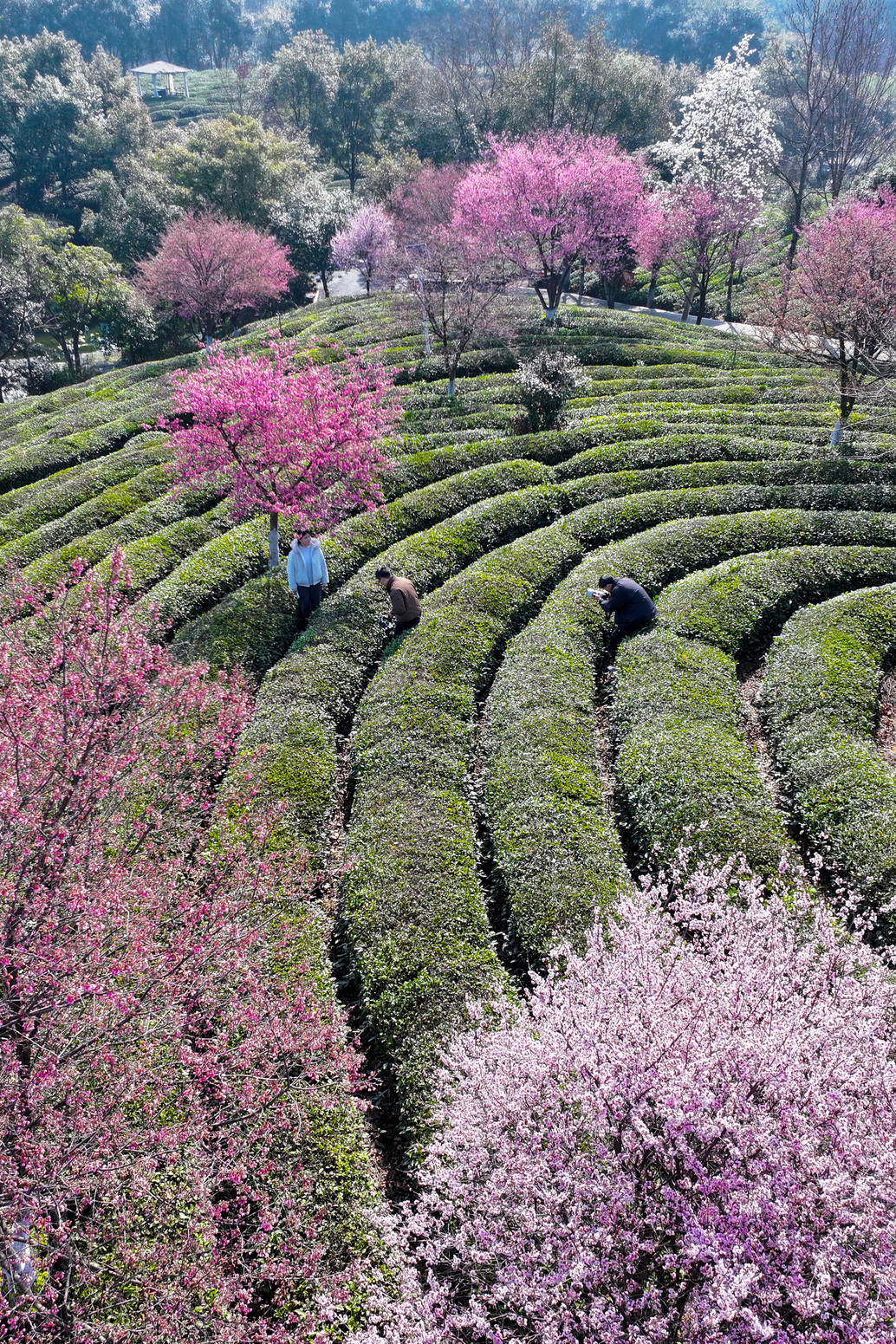 3月12日,徽州区谢裕大茶博园,游客在生态茶园踏春赏花,乐享明媚春光。