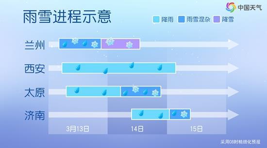 从中国天气网推出的雨雪进程图来看,今明天北方部分地区将出现雨雪转换,雨雪分界线可能位于四川北部至山西南部一带。省会、首府、直辖市中,西宁、兰州、银川、呼和浩特、太原、济南都会出现降雪,西安因为关中地形且海拔较低,或以降雨为主。