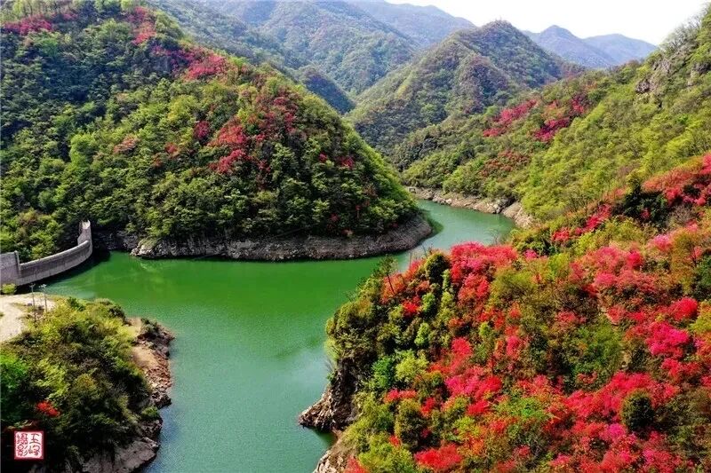 这里是全县映山红开得最早的地方,等到花开满山的时候,远远望过去,整片山坡都是红的,特别壮观。更特别的是,杜鹃岭脚下修建有小型水库,道道山梁之间溪水常年不断,映山红沿山溪、水库边生长。正是这种独特的小环境,让皂河村的映山红早于他地半月盛开,又晚于他地谢幕。