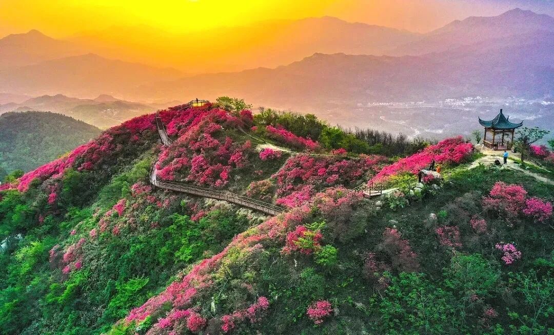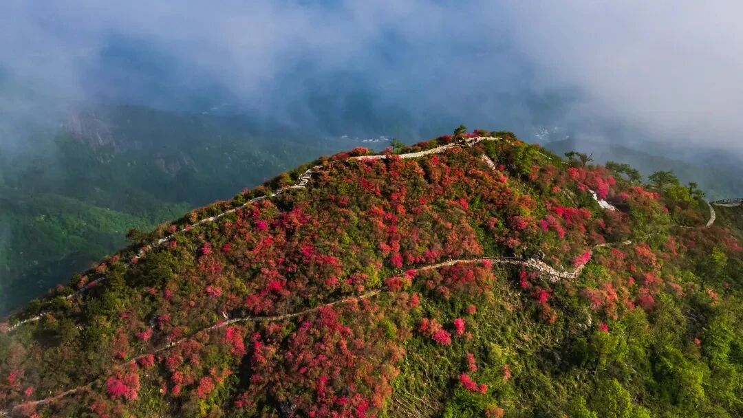 由于海拔高、气温低,摸云山的映山红开花最晚——当别处花事已了,这里才刚迎来盛放,因此被称为“大别山最后一抹春色”。花开时节,整座山峰被染得红艳艳的,灿若云霞,直插云霄,极具视觉冲击力。清晨时分,还能邂逅云海翻腾的壮观景象。