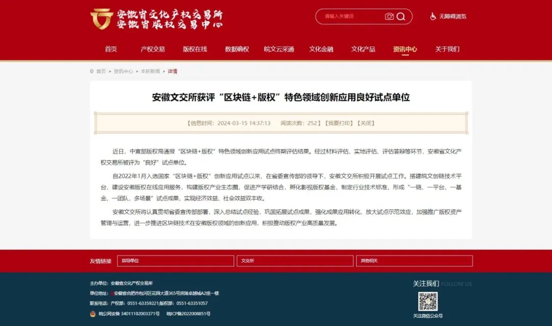 2024年5月,中央网信办通报国家区块链创新应用试点终期评估情况,安徽省文化产权交易所获评国家“区块链+版权”创新应用良好试点单位。