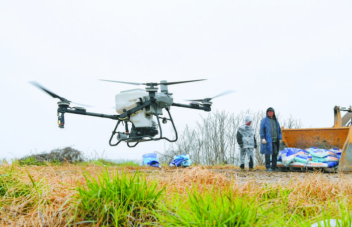 3月18日,合肥市蜀山区小庙镇袁中社区一处麦田里,农民正忙着使用无人机为小麦施肥。当前正值春季田管的关键时节,合肥市蜀山区小庙镇积极引入科技化田管技术,指导农户采取无人机施肥,提高工作效率、助力增产丰收。通讯员 陈三虎 摄 (安徽图片网供图)