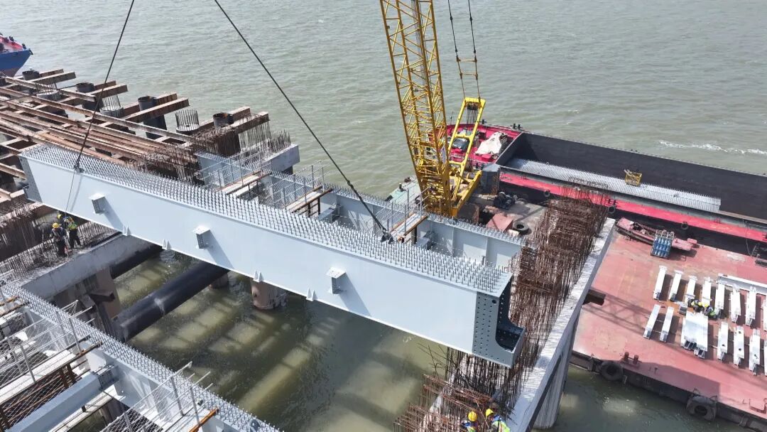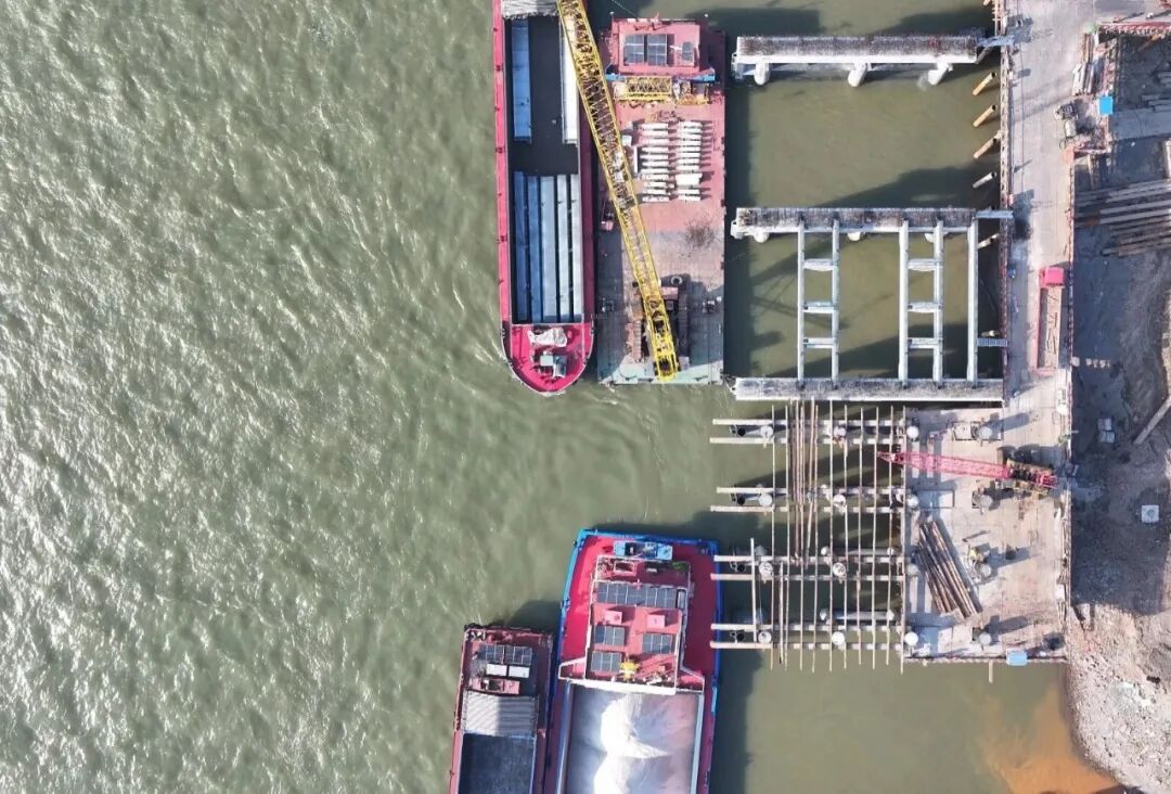 在长江东流段岸边,水域施工正掀起热潮。150余名工人在浮吊船与钢桁梁间协同作业,一号泊位第一跨正在进行钢桁梁的精准架设。