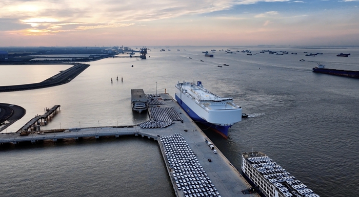 图为奇瑞出海车辆即将登船