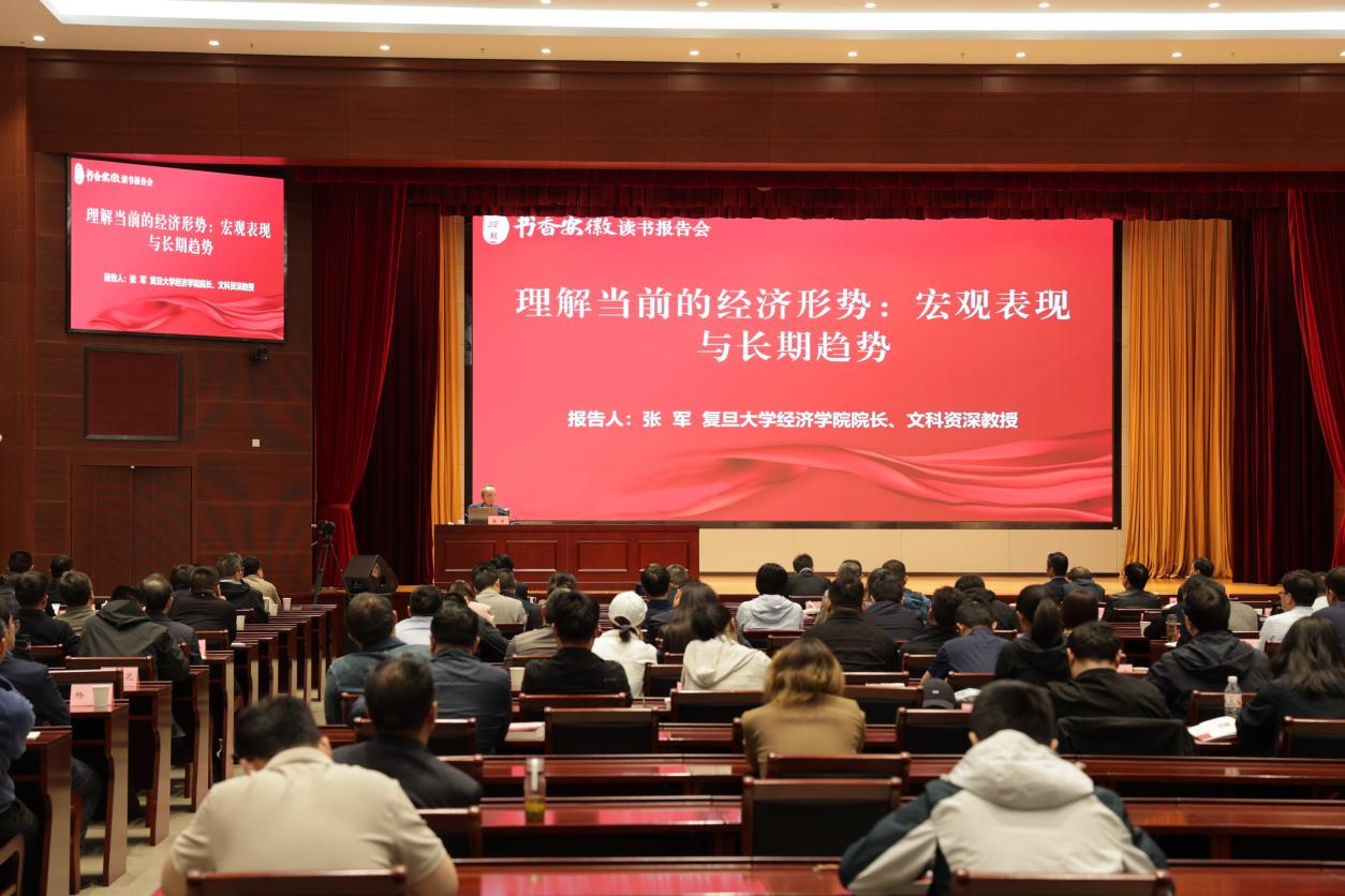 中安在线、中安新闻客户端讯 4月26日上午,第三十二期“书香安徽”读书报告会在合肥举办。复旦大学经济学院院长、文科资深教授张军作“理解当前的经济形势:宏观表现与长期趋势”专题辅导报告。省直及部分中央驻皖单位负责同志150余人参加。