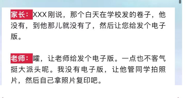 家校矛盾的爆发,往往始于小事,激化于情绪。整件事的起因再普通不过,家长想要试卷电子版,方便孩子复习巩固,是对孩子学习负责的表现。整个沟通过程,家长礼数周全,没有过分要求,也没有言语冒犯。老师面对额外工作,或许恰逢疲惫烦躁,或许长期被各类消息打扰,一时没能控制住语气,脱口而出的重话,戳伤了家长,也引爆了矛盾。问题本来不难解决,传一份文件举手之劳,耐心解释一句便能相安无事。可偏偏双方都被情绪牵着走,少了一点耐心,缺了一点体谅,把解决问题的沟通,变成了比拼态度的对峙,让原本简单的小事,硬生生复杂化。