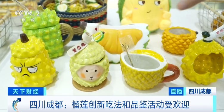 榴莲抵达成都后,市民游客们除了能够品尝到新鲜的榴莲果肉,还能体验到一系列的创新吃法。比如,榴莲咖啡使用的全部是新鲜的榴莲果肉,放置在榴莲壳当中。还有根据榴莲形状制作的咖啡杯、纸巾盒、针织品等文创。