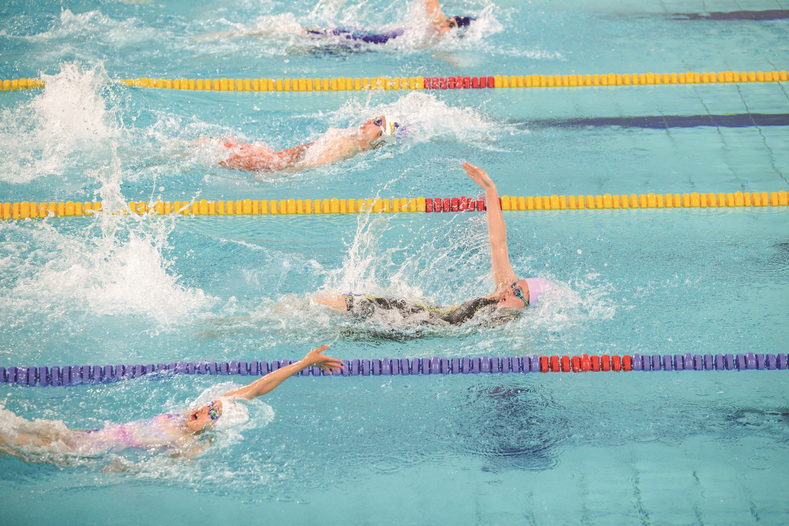 4月25日,滁州奥体中心游泳馆,运动员在女子综合一组50米仰泳决赛中奋力比拼。