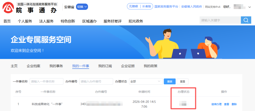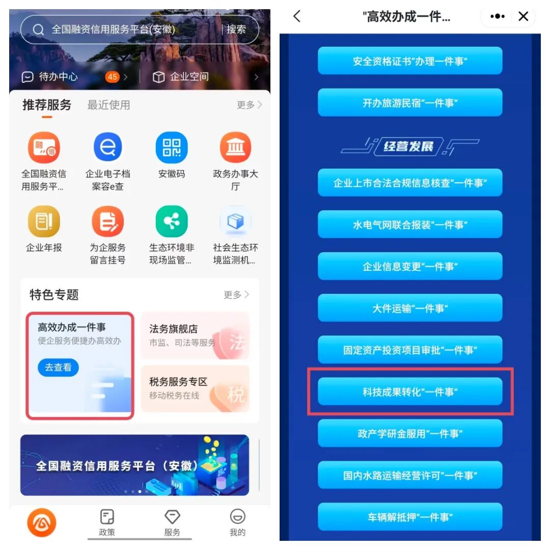 1、打开“皖企通”APP,在首页点击“高效办成一件事”专区,找到“科技成果转化一件事”,点击进入。
