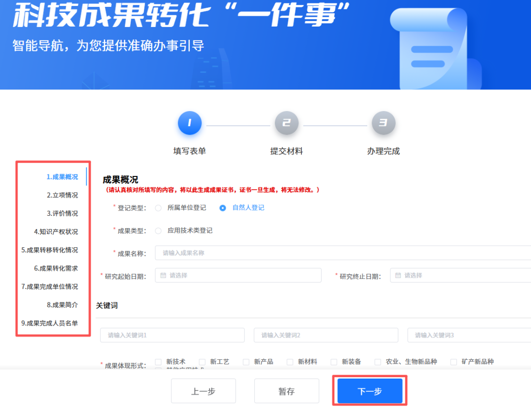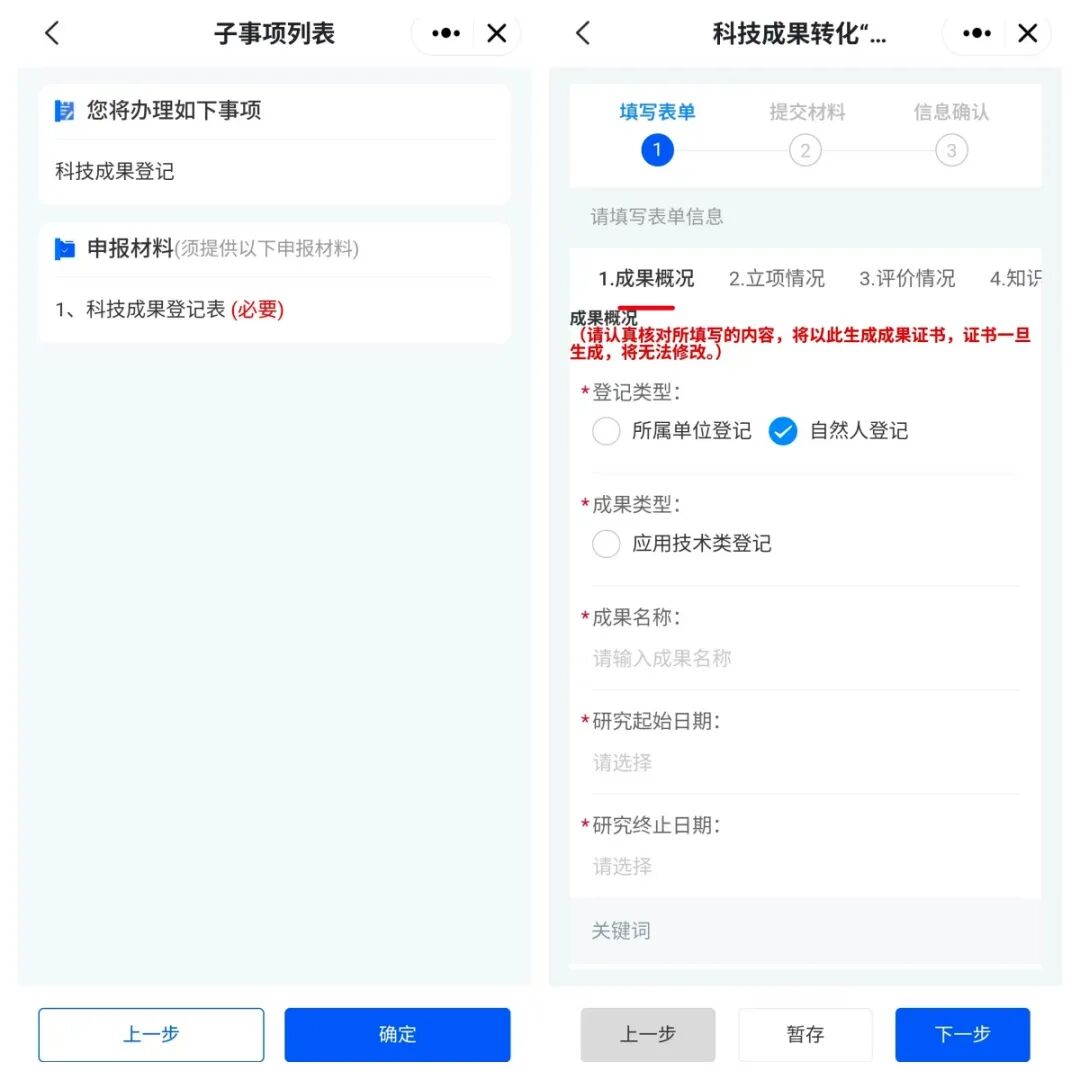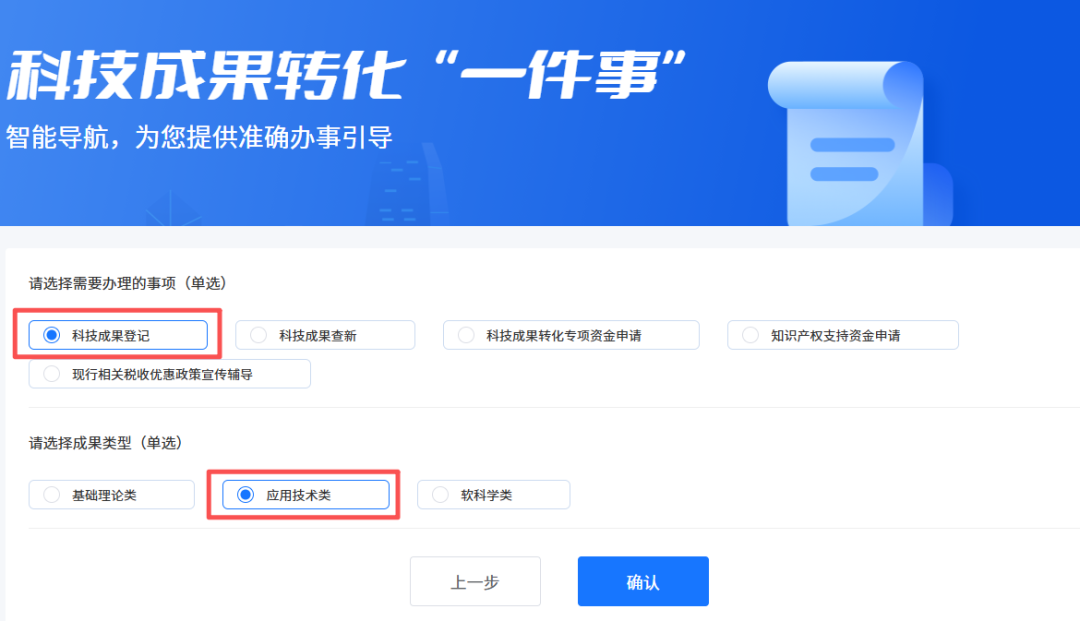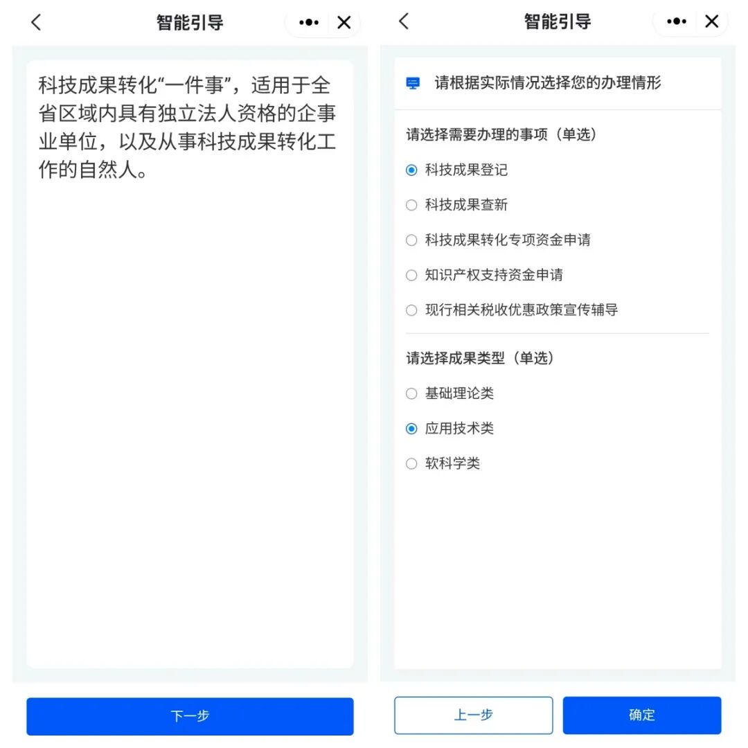 2、查看“智能引导”,点击“下一步”后根据实际办理需求选择对应的选项,这里以“科技成果登记(应用技术类)”为例,点击“确定”。