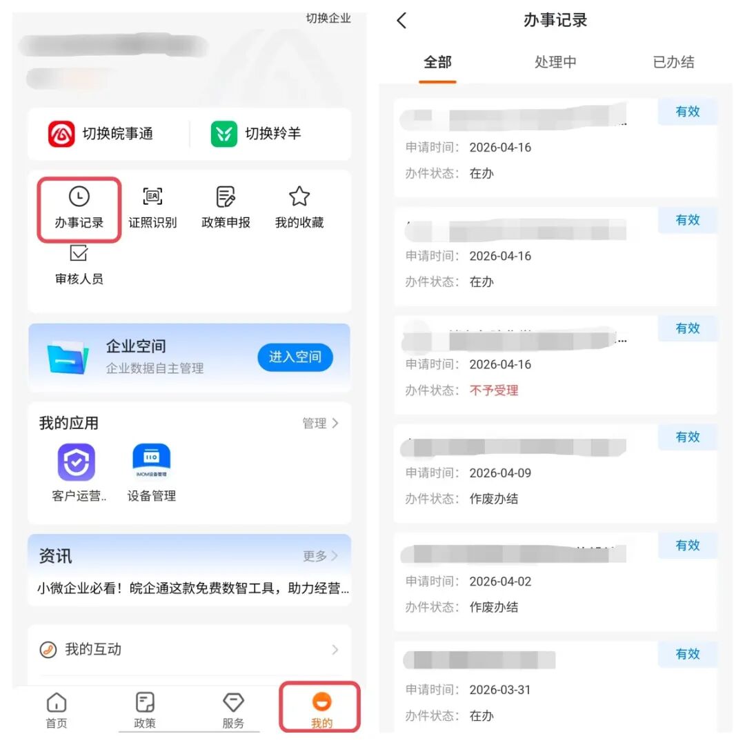 4、查看办事进度可登录“皖企通”APP,点击页面右下方“我的”,找到“办事记录”即可查看办理进度详情。