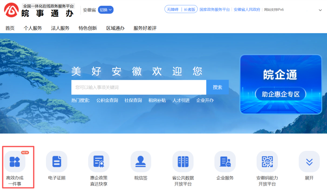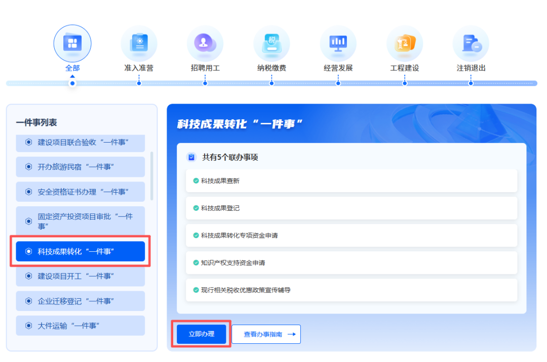 1、登录安徽政务服务网,点击“高效办成一件事”,选择“企业办事”后在左侧列表中找到“科技成果转化一件事”,点击“立即办理”。
