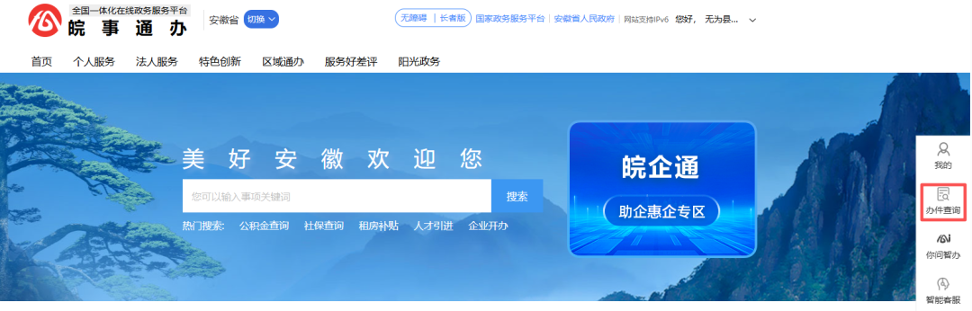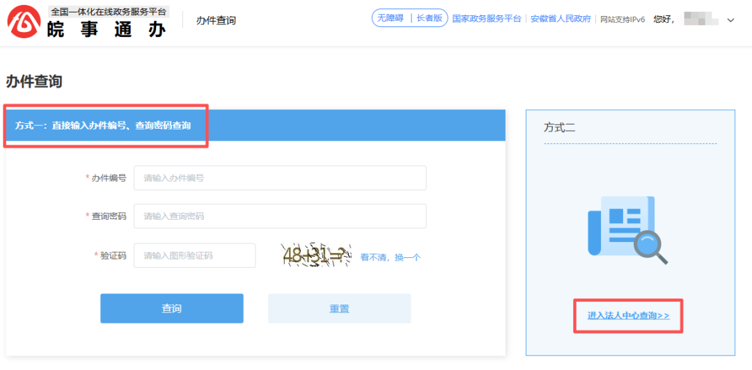 4、操作完成后,可登录安徽省政务服务网,点击页面右侧“办件查询”,查询该业务的办理进度。(方式一:直接输入办件编号、查询密码和验证码查询;方式二:进入法人中心“我的一件事”菜单查询)。