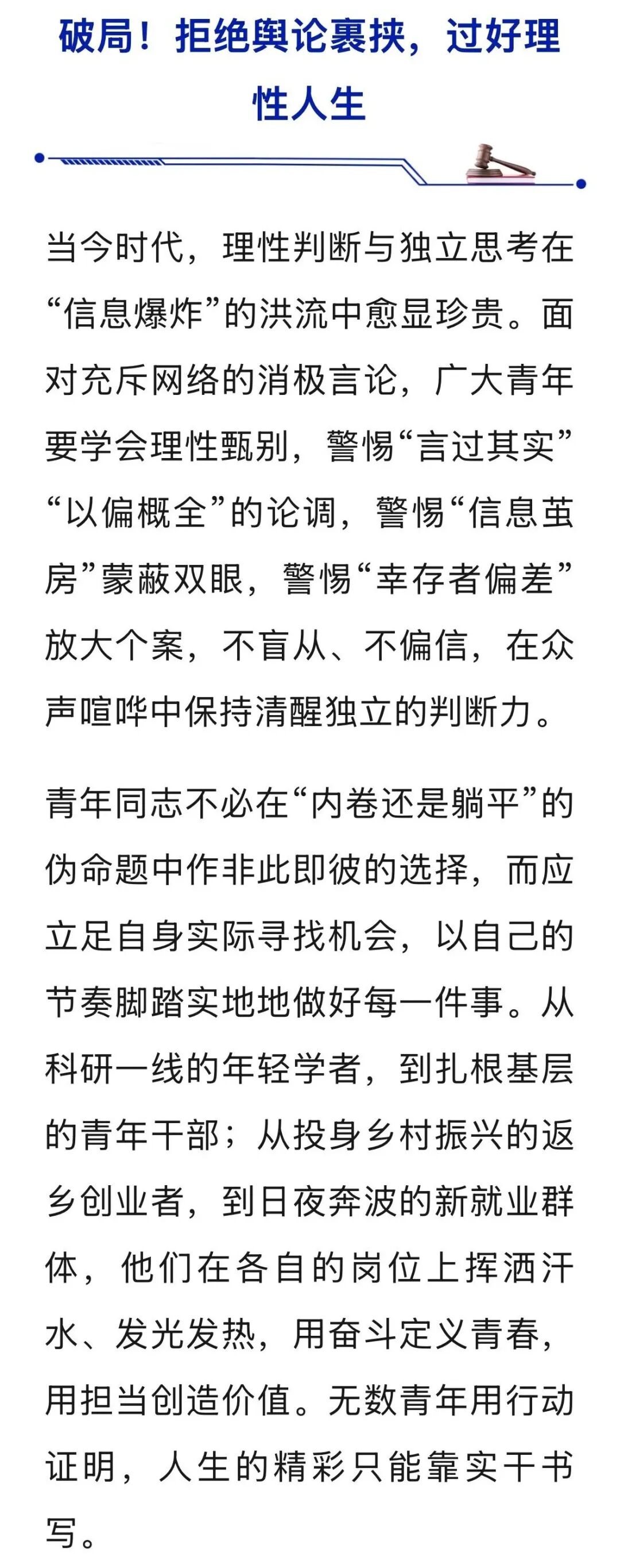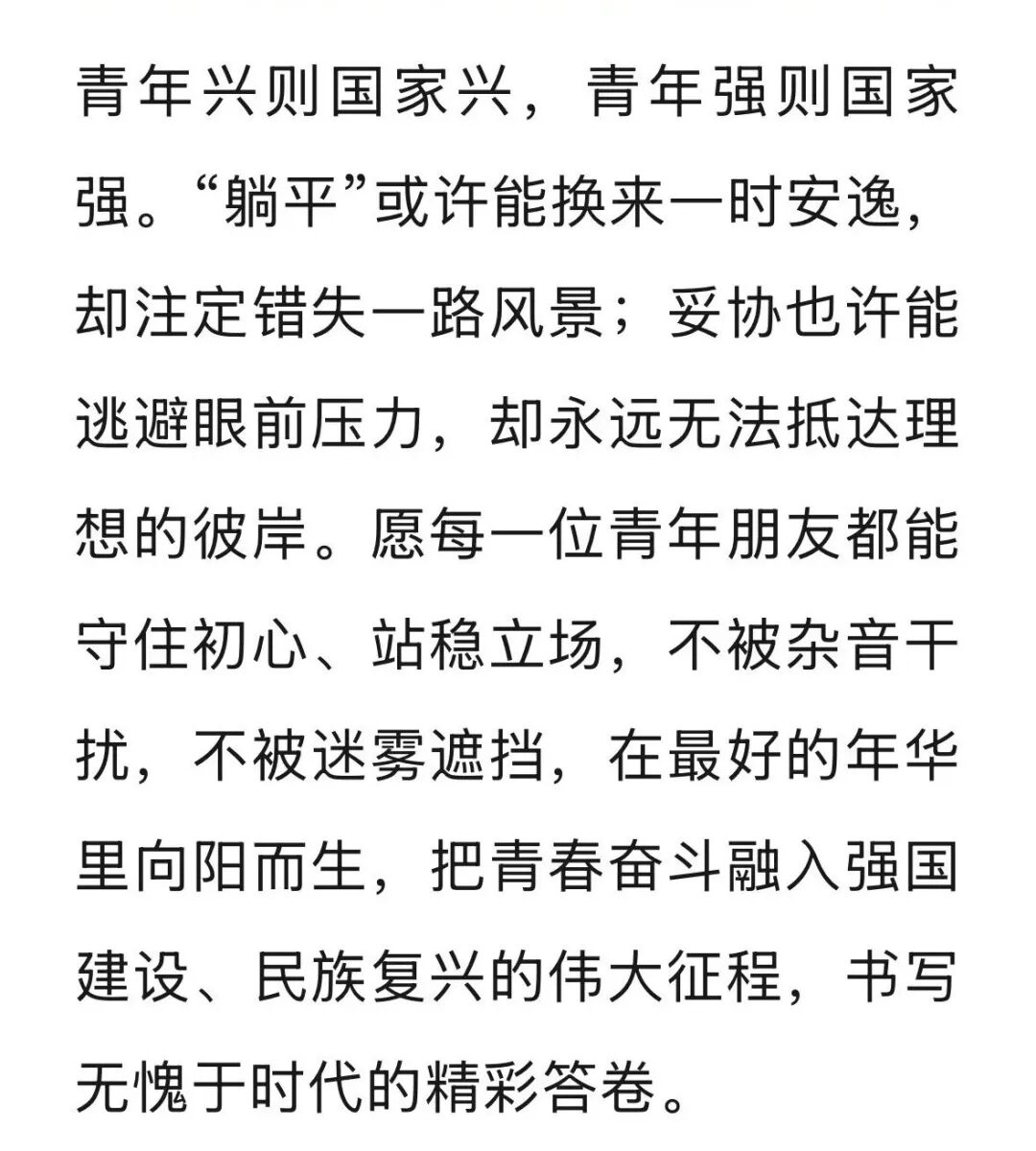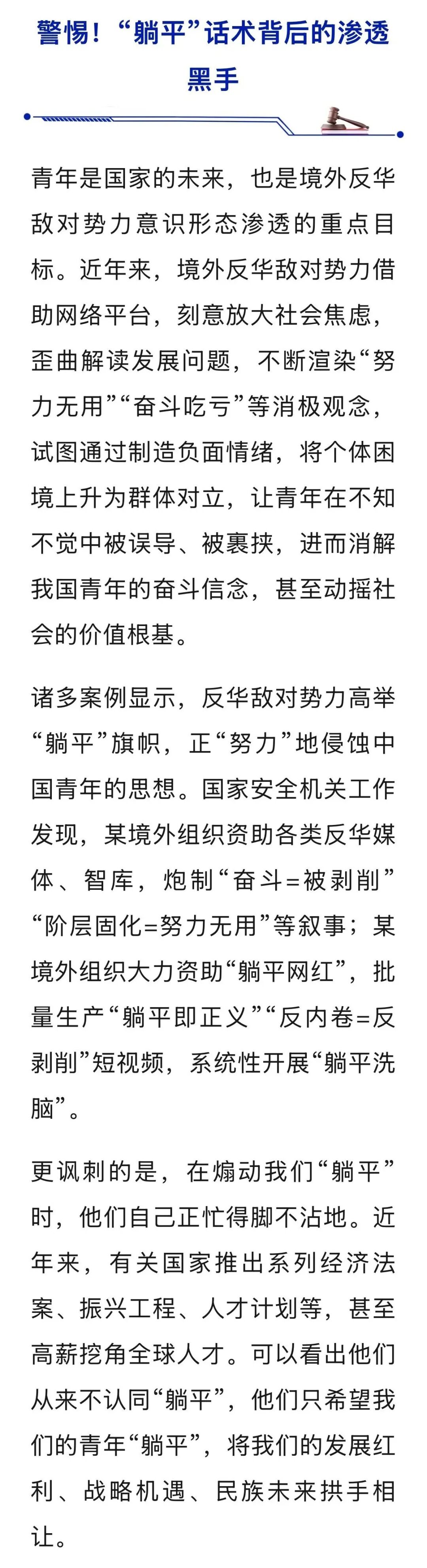 当“卷不动就躺平”频繁见诸网络,当“摆烂是最优解”反复刷屏,身处舆论场的青年难免陷入迷茫。但面对扑面而来的消极情绪,我们必须擦亮双眼、保持清醒,警惕这些看似平常的“躺平”论调背后暗藏的复杂舆论陷阱。