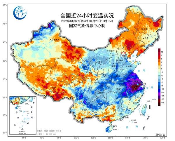 尤其对比昨天接近或达到30℃的暖热状态,反差非常大,像安徽、浙江局地24小时降温幅度甚至接近20℃。