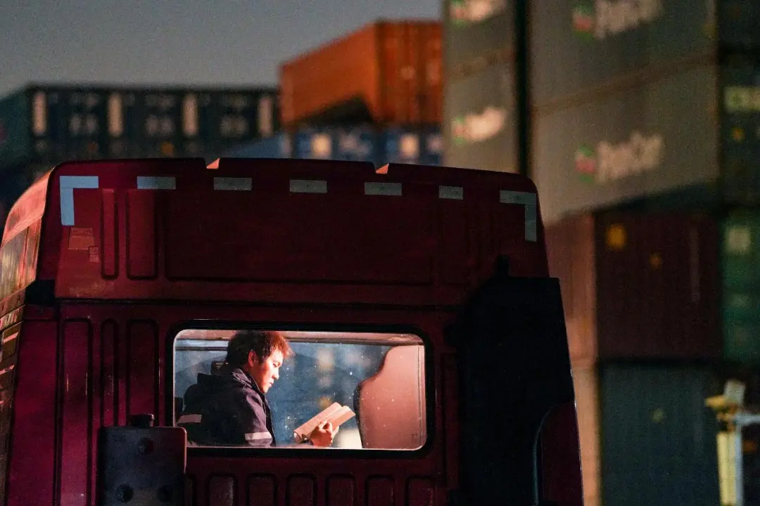 在浙江省宁波市北仑区,集卡司机陈浩利用装卸货间隙专注阅读,这位扎根港城的“新宁波人”,7年间将驾驶室打造成“移动书屋”,5年累计读书400余本。章勇涛摄(影像中国)